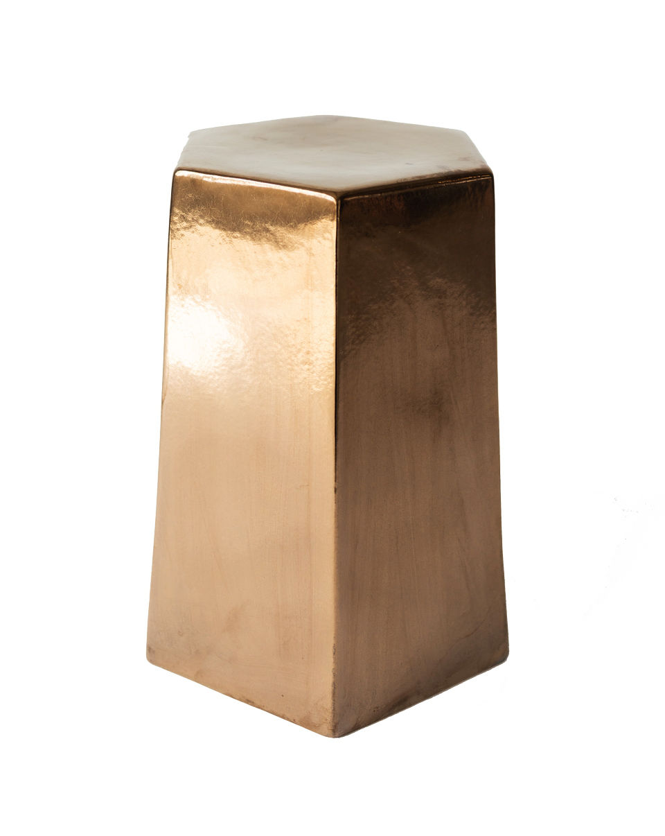 Rentals Tables Cally Side Table Search View Wishlist Cally Side Table Price: $30.00 Description: Glazed ceramic side table in a hexagon patern. Quantity: 2 Dimensions: 15 x 13 x 18 Tags: table, lounge, gold, reception, stool, wedding, events Add to Wishlist