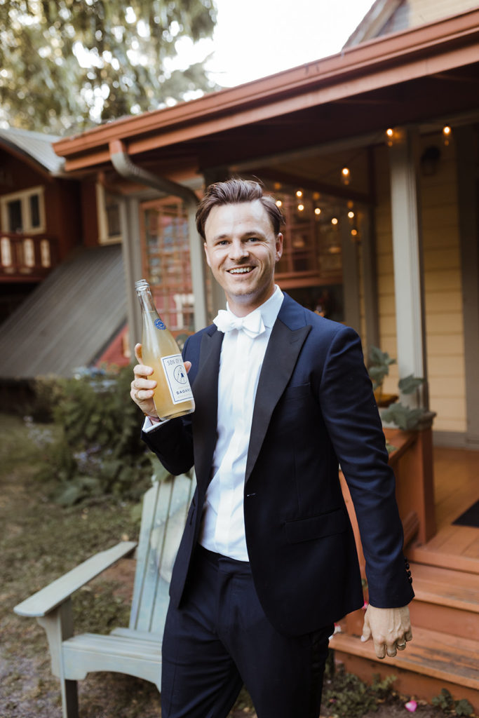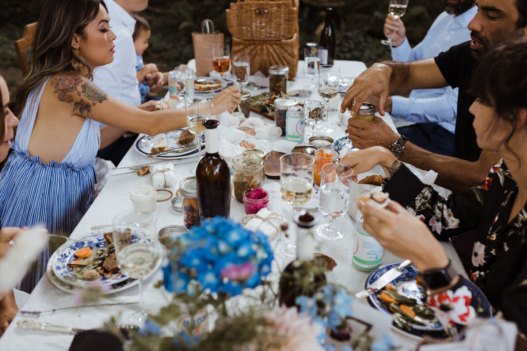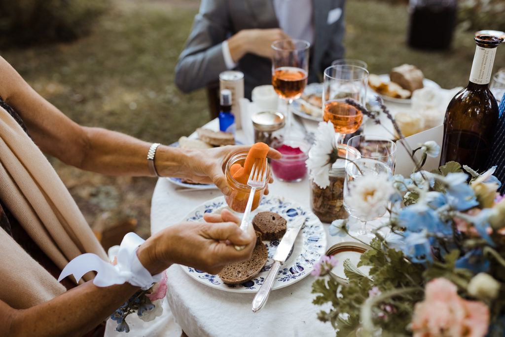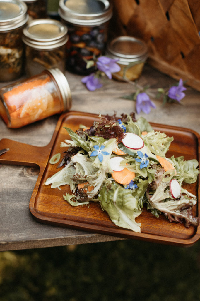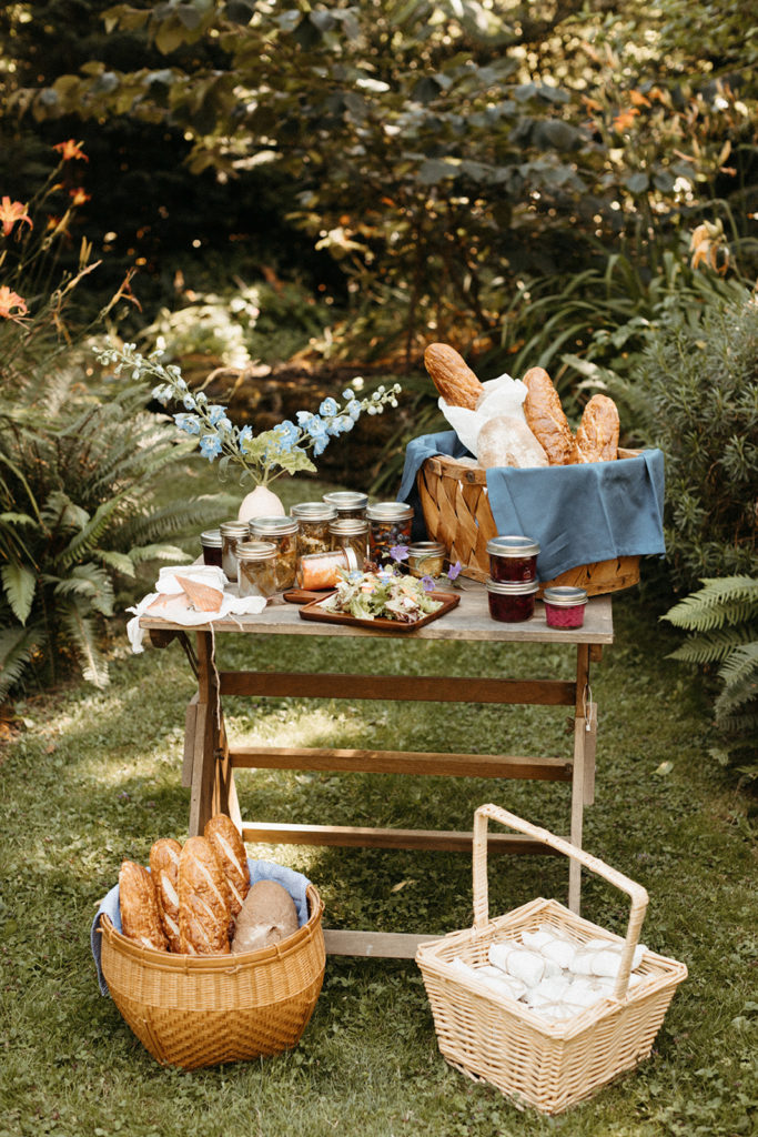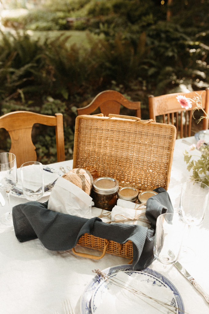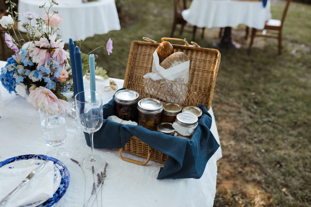 Each table received a custom basket from the caterers with smoked salmon, pickled vegetables, fruit, cheeses and different kinds of jam. The bread was baked by the caterers as well as using all local, handmade ingredients. It was a farm to table feast!